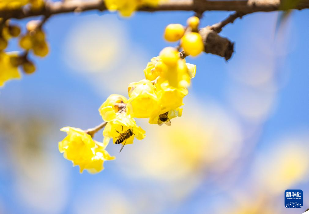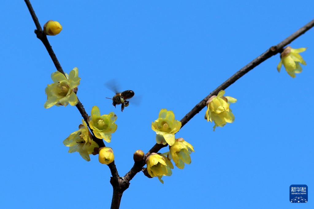 1月5日,在贵州省黔南布依族苗族自治州都匀市南沙洲公园,蜜蜂在腊梅花间飞舞。新华社发(肖伟摄)
