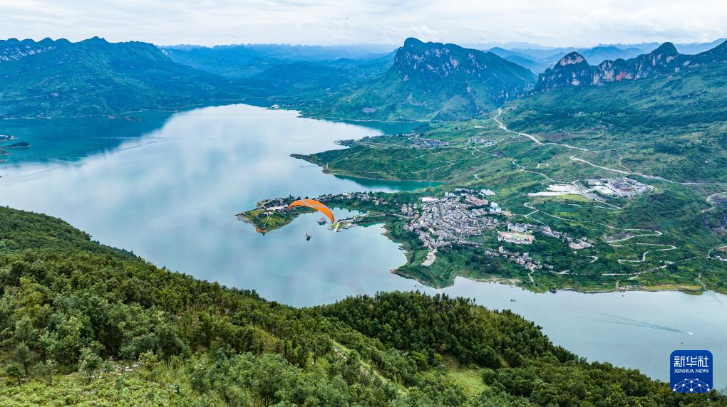 游客在六盘水市六枝特区牂牁江畔体验低空滑翔飞行(7月9日摄,无人机照片)。新华社记者 陶亮 摄