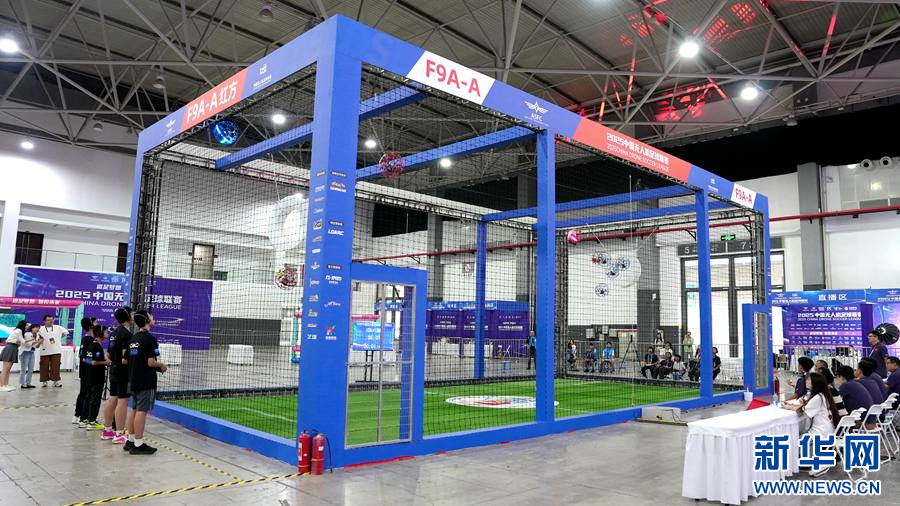 比赛现场,参赛队伍操控装有球形保护框的无人机在特制笼区内展开竞技,通过将无人机足球射入对方球门得分。多支专业队伍的精彩演示,展现了无人机飞控技术与团队协作的完美结合。