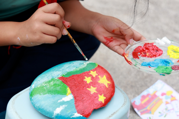 国旗、敬礼的军人……一个个鲜活的红色元素,在方寸之间的石头上跃然而生。在孩子们的笔下,对祖国的热爱犹如一团炽热的火焰,绽放出绚丽夺目的光彩。已有四年“石头画”社团经验的秦雨涵,运用自己积累的绘画功底,精心构思并完成了一幅国旗作品,以此表达对祖国最美好的祝愿。