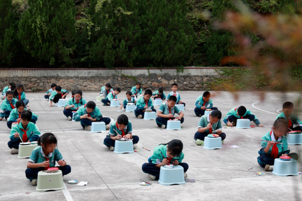 在学校操场上,孩子们席地而坐,手执彩笔,俯身于精心挑选的石头上专注勾勒。随着稚嫩的小手飞舞,斑斓的色彩渐次铺展,普通的石头被赋予灵动的生命,每一笔都凝结着对祖国最纯真的祝愿。