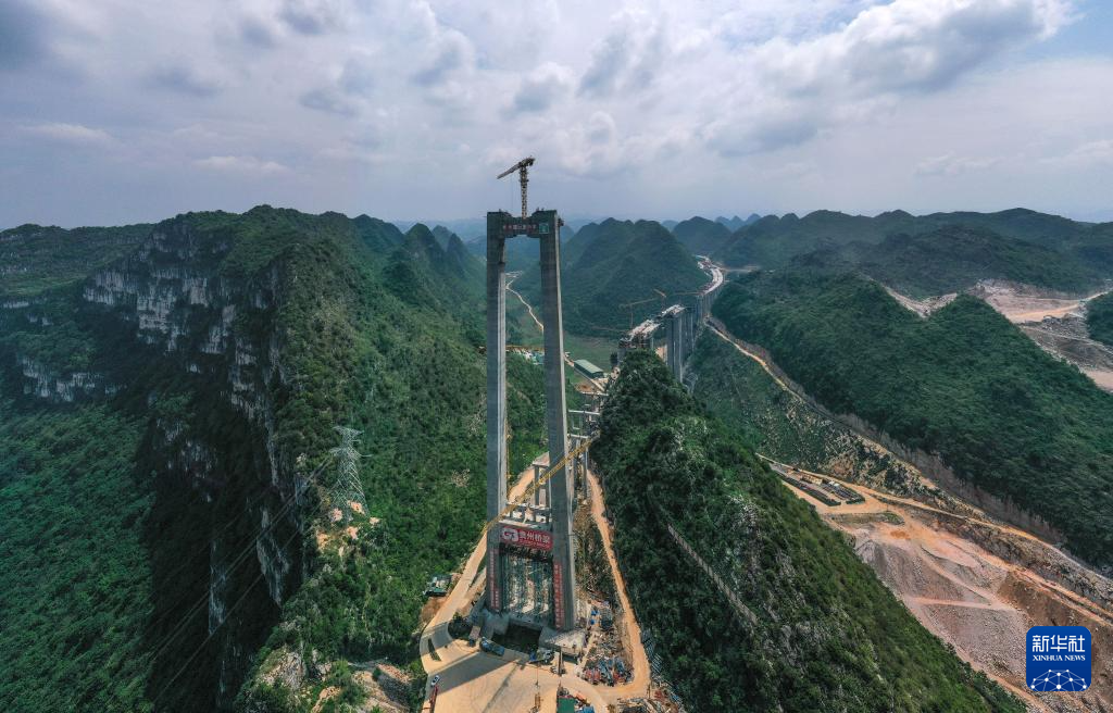 2023年6月14日拍摄的贵州花江峡谷大桥桥塔施工现场(无人机照片)。新华社记者 杨文斌 摄
