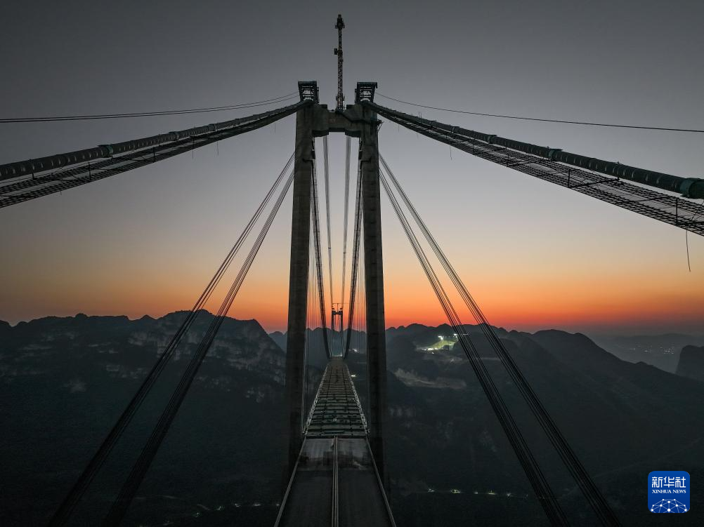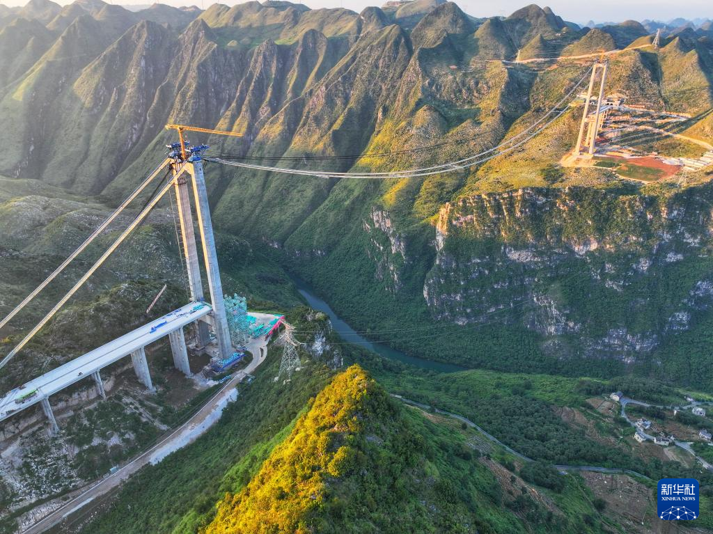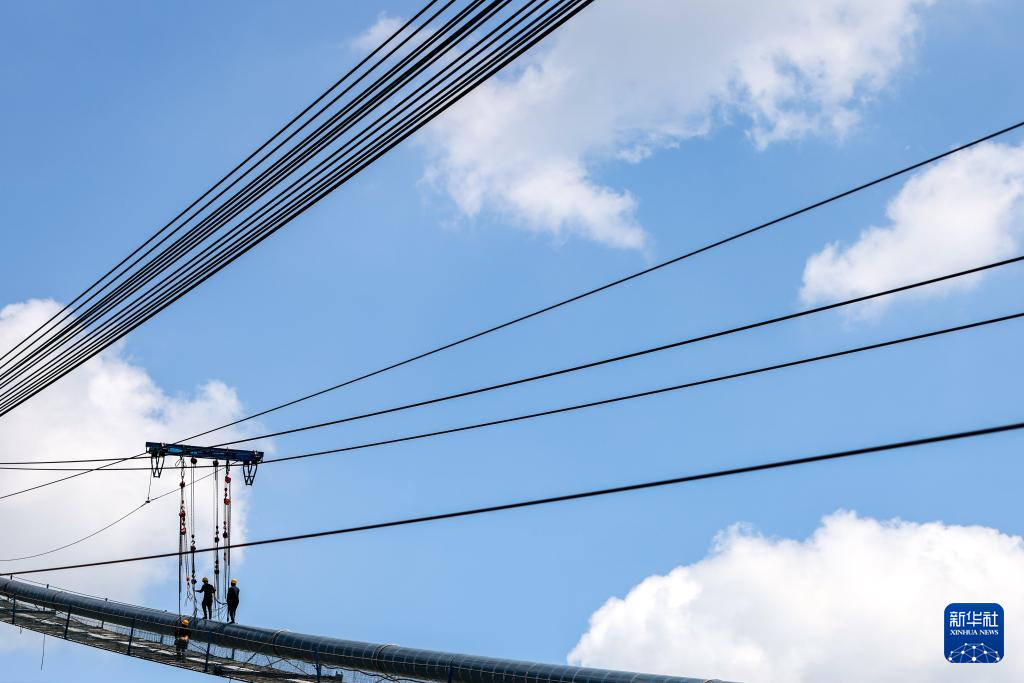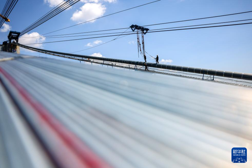 2024年9月4日,工人在贵州花江峡谷大桥的猫道上施工。新华社记者 欧东衢 摄