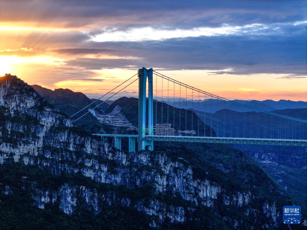 2025年9月27日拍摄的晚霞中的贵州花江峡谷大桥(无人机照片)。新华社记者 欧东衢 摄
