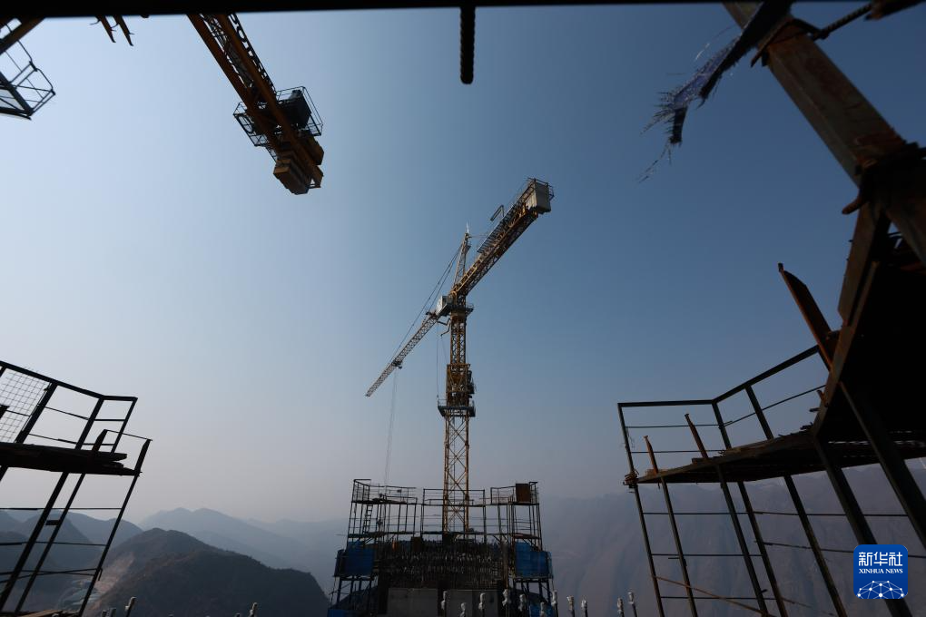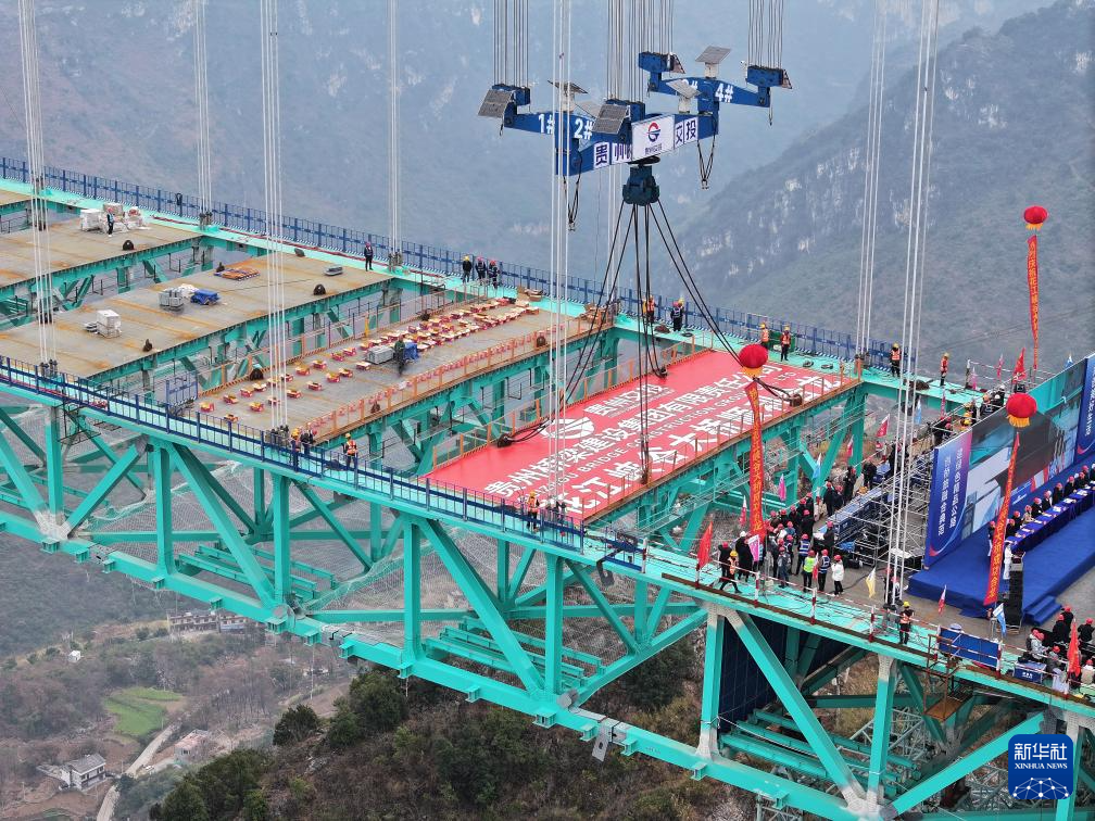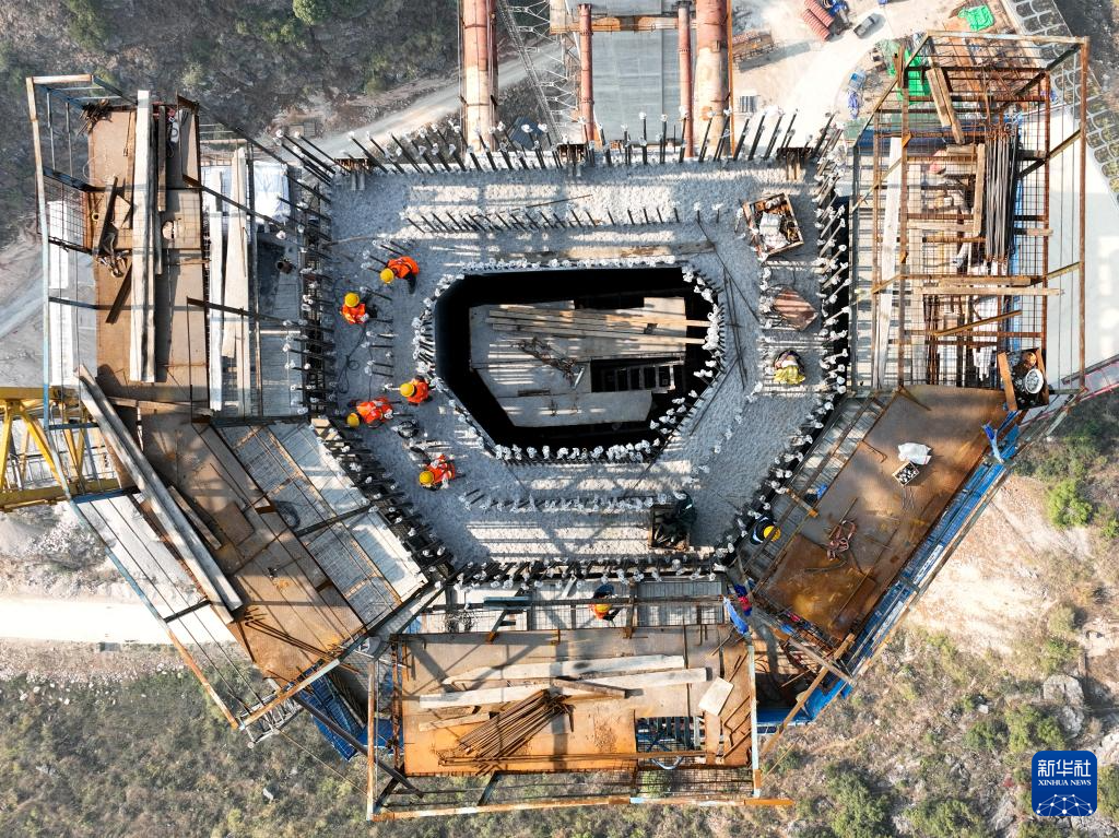 2023年2月1日拍摄的贵州花江峡谷大桥主塔施工现场(无人机照片)。新华社记者 欧东衢 摄