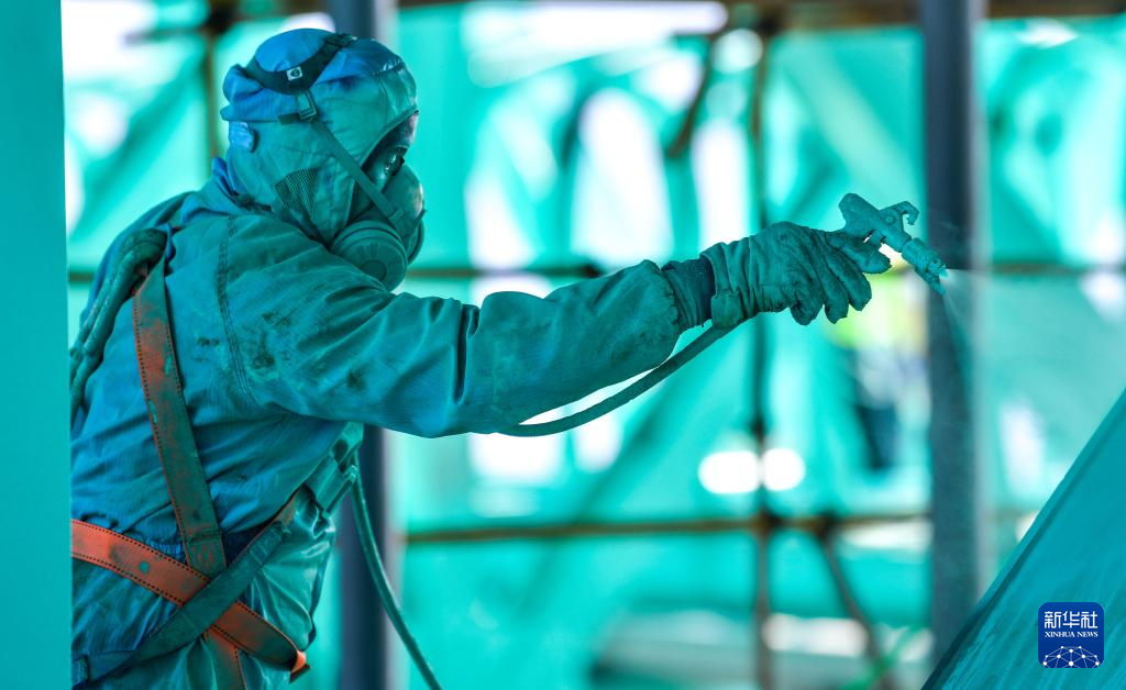 2025年6月11日,工人在贵州花江峡谷大桥上给桥体喷漆。新华社记者 杨文斌 摄