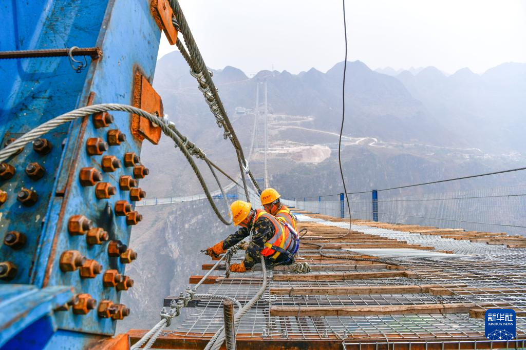 2024年3月27日,工人在贵州花江峡谷大桥上加固施工猫道。新华社记者 杨文斌 摄
