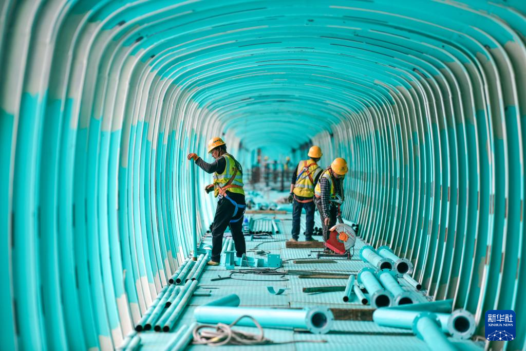 2025年6月6日,工人在贵州花江峡谷大桥桥塔顶上施工。新华社记者 杨文斌 摄
