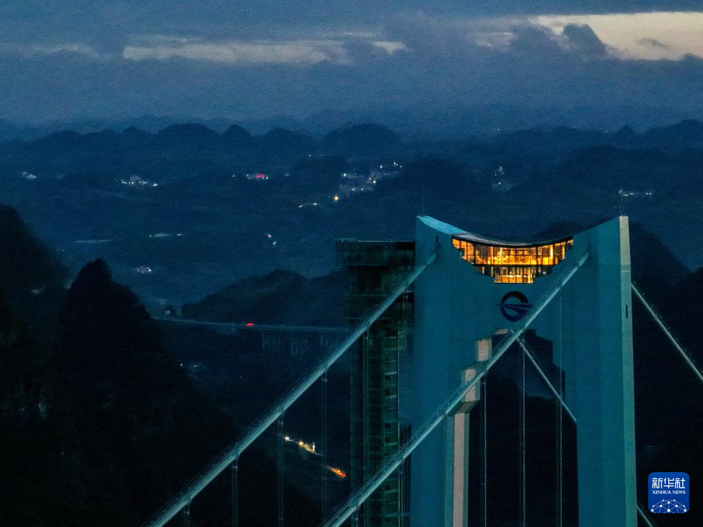 9月27日拍摄的暮色中的贵州花江峡谷大桥(无人机照片)。新华社记者 欧东衢 摄
