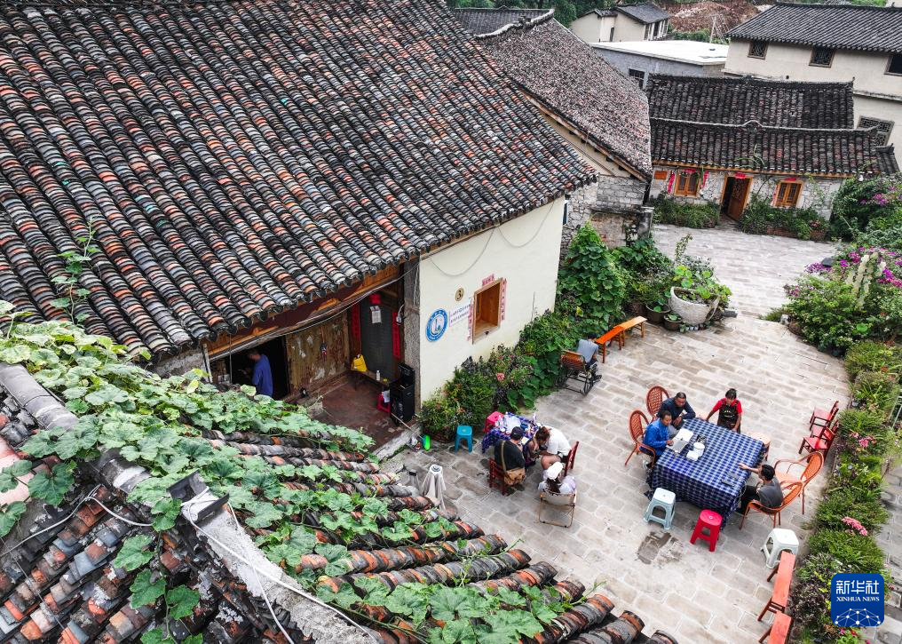 9月27日,在贵州省贞丰县平街乡花江村,返乡创业村民林国权(蓝衣者)在“布依桥缘居”民宿里与入住的客人聊天(无人机照片)。新华社记者 杨文斌 摄
