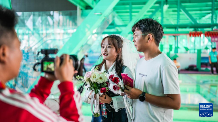 领取了结婚证的新人在服务区露台合影留念(9月28日摄)。新华社记者 陶亮 摄