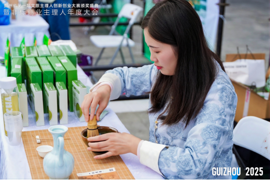 “手腕要稳,茶筅快速击拂,直到茶汤表面泛起白沫……”9月27日,在贵州省第一届文旅主理人创新创业大赛的畅玩市集上,抹香集品牌主理人袁露正手把手教“90后”游客彭烨体验宋代点茶技艺。彭烨手执竹制茶筅,在茶碗中快速搅动,抹茶粉与水逐渐交融,泛起细密泡沫,随后他轻啜一口已成凝脂状的茶汤,惊喜道:“淡淡的茶香,一点也不涩!”