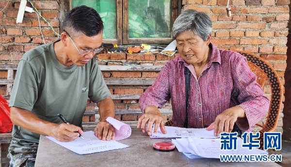 贵州农发猕猴桃公司工作人员与果农胡学兰(右)签订收购协议(9月9日摄)。新华网 卢志佳 摄