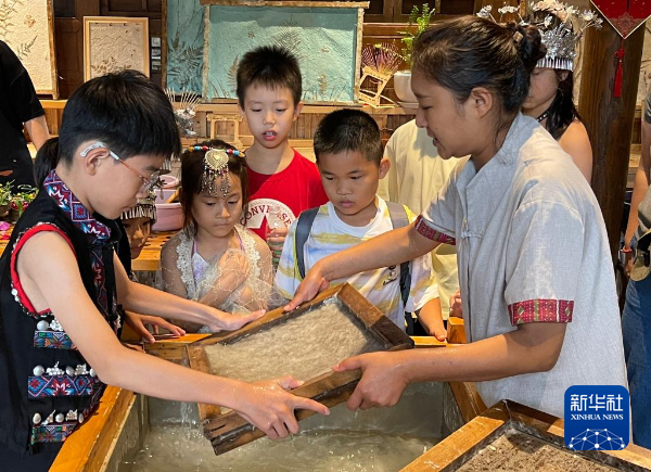 广东中学生陈晓宇在指导下,将竹帘浸入纸浆池,捞出薄如蝉翼的纸胚,兴奋地说:“原来纸是这么做的,亲手做特别有趣!”作坊还创新推出花草纸体验,家长与孩子一起铺上花草,制作独一无二的工艺品。