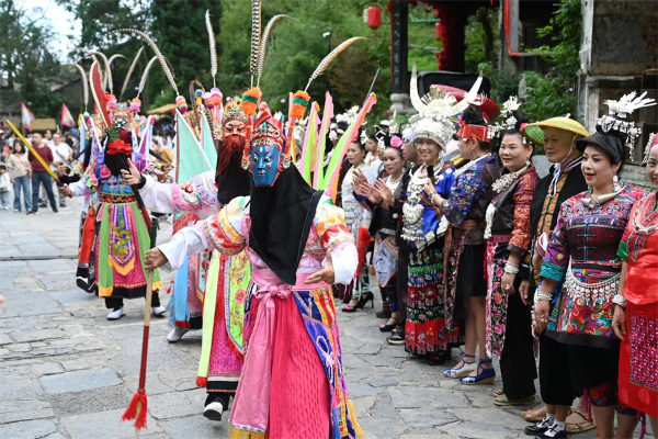 云峰屯堡景区盛大开启“上云峰屯堡,逛明‘潮’市集”活动,创新实景沉浸式剧游让游客通过角色扮演、任务探索等方式深度体验屯堡文化的独特魅力,首场“村T”走秀惊艳亮相,头戴地戏面具的非遗传承人、手持油纸伞的屯堡孃孃和专业模特并肩而行,侗族银饰与明代华裳在此碰撞,苗绣图腾与现代设计彼此交融,织就六百年古巷的多彩新画卷。铜仁五显庙文旅街区立足传统祈福文化,持续擦亮财神咖啡、千山吉市等丰富业态,可爱逗趣的五路财神互动和音乐演出也深受市民游客青睐。