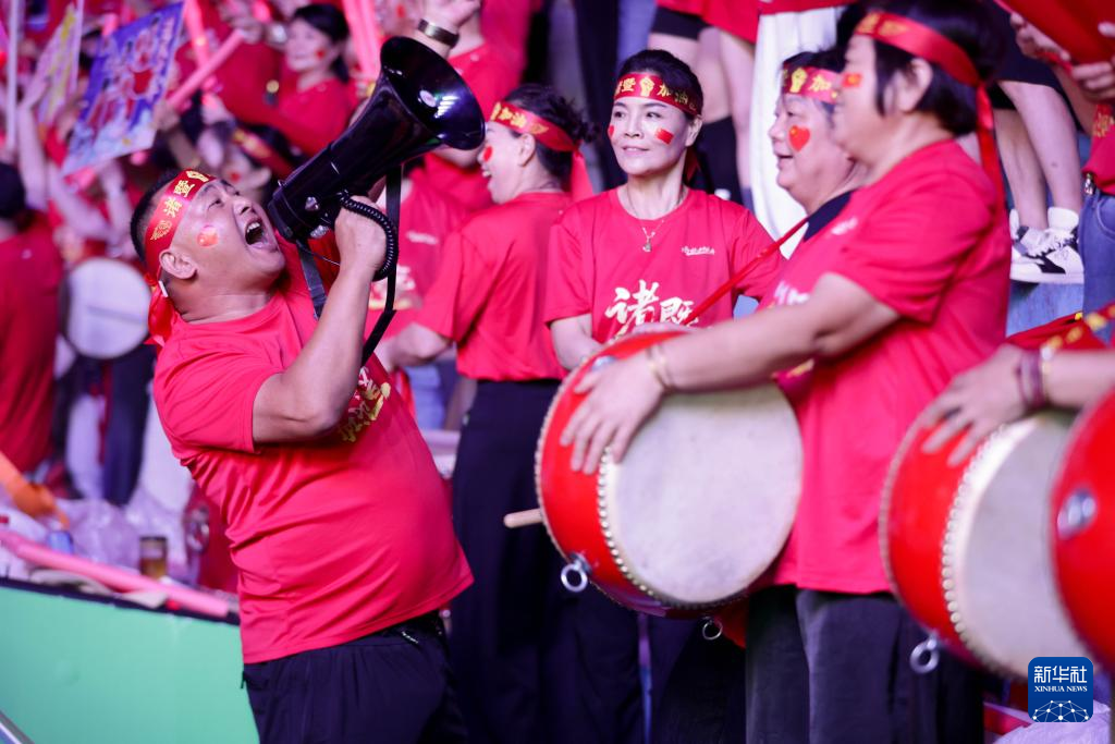 10月12日,浙江诸暨队的拉拉队在比赛中给球员加油。新华社发(袁福洪 摄)