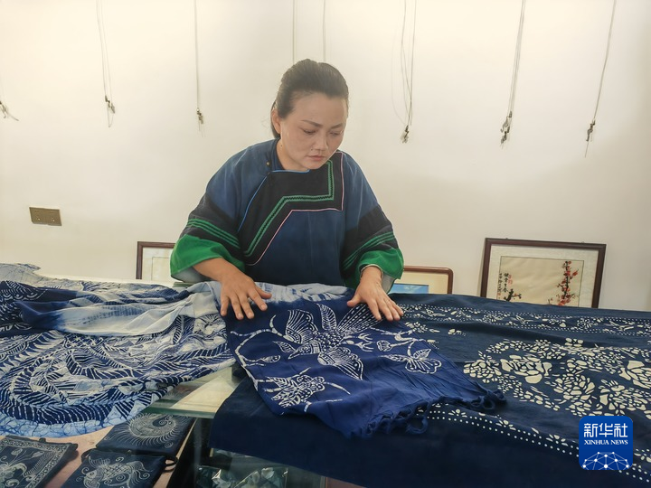 杨丽在整理她收藏的黔绣作品。新华每日电讯记者汪军摄