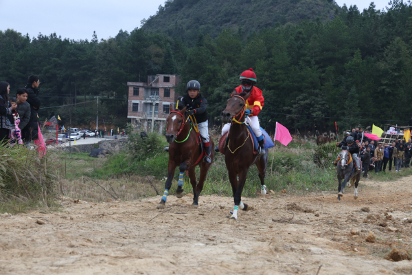 赛道上,裁判员一声令下,骑手扬鞭策马,如箭一样奔向前方,骑手们你追我赶地驰骋在乡土赛道,上演水族独有的速度与激情。观众的助威呐喊声不断,现场高潮迭起、热闹非凡。
