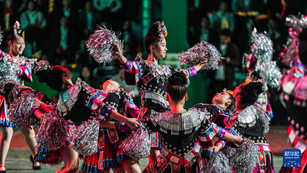 4月13日,演员在启动仪式上进行歌舞表演。当日,大地流彩·2025年全国和美乡村篮球大赛(村BA)启动仪式在贵州省黔东南苗族侗族自治州台江县台盘村举行。新华社记者 陶亮 摄