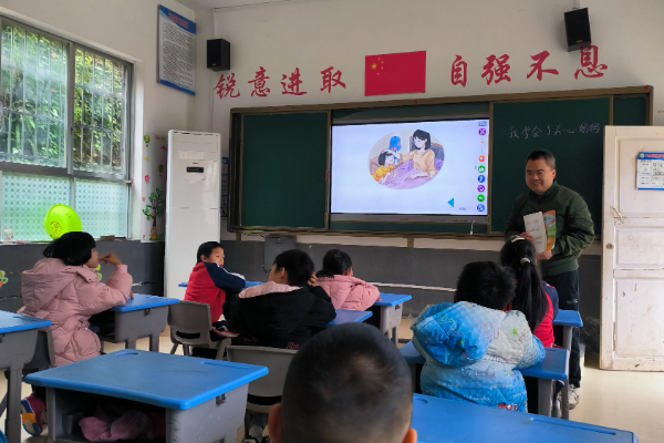 近日,在平塘县特殊教育学校培智班教室内,老师正借助多媒体屏幕播放课文动画,引导学生学习知识。孩子们目不转睛地盯着屏幕,积极与老师互动,课堂氛围活跃。