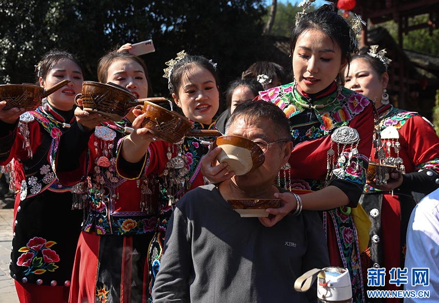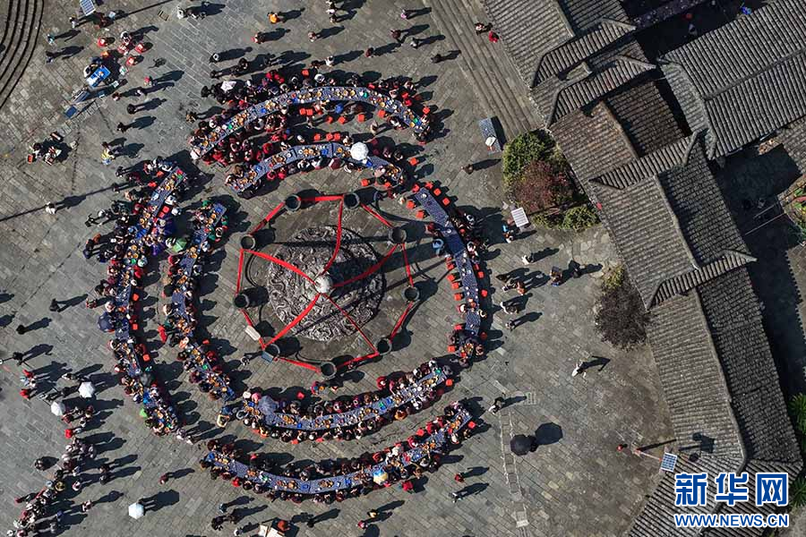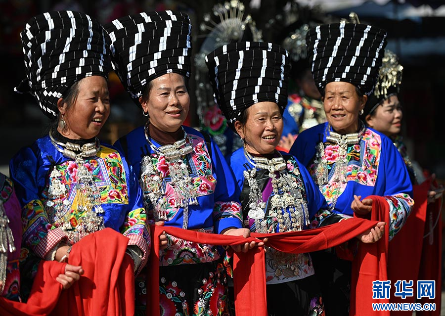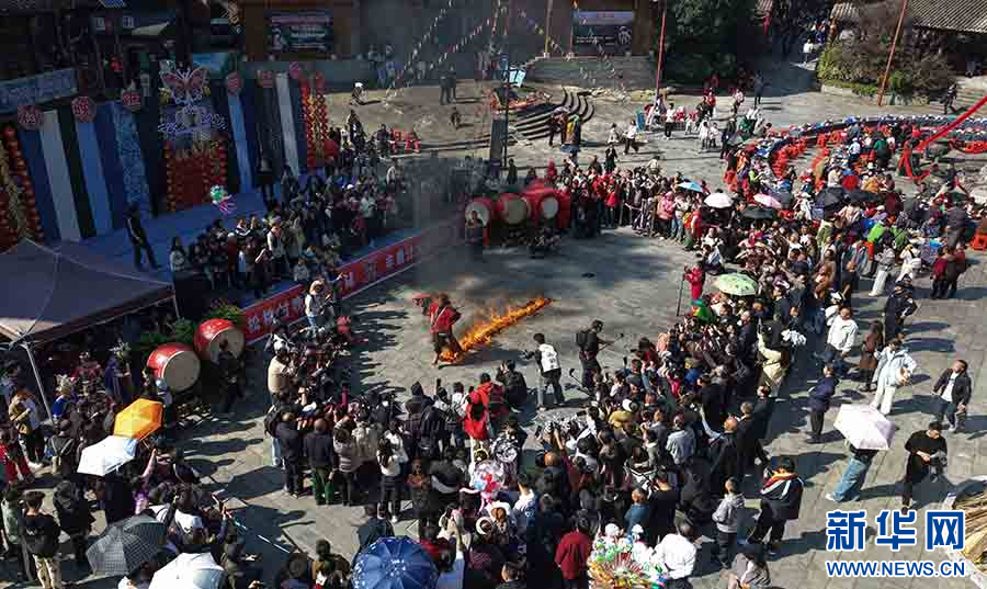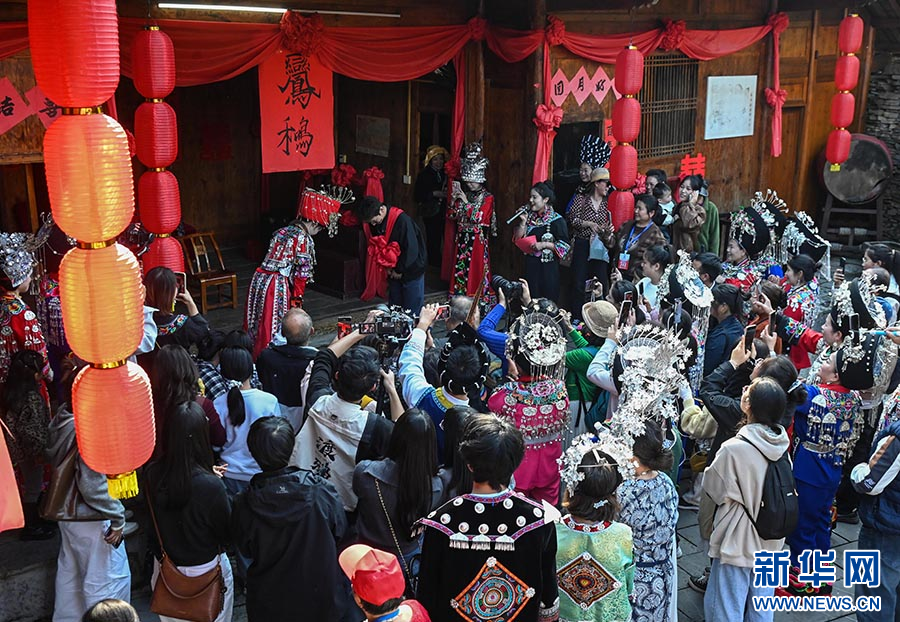 当日,在贵州省铜仁市松桃苗族自治县正大镇苗王城景区内,吊脚楼前挂起红灯笼,石板路上铺满欢声笑语,“松桃村晚进苗王城——非遗过大年”活动举行。身着盛装的苗族同胞与来自四面八方的游客欢聚一堂,载歌载舞共庆苗年。