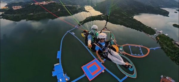 游客在红水河景区坐滑翔伞。