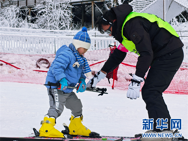雪场上在教练指导下游玩的孩童。新华网发(王杰玉 摄)
