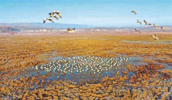 1月13日,黑颈鹤、灰鹤等越冬候鸟在草海国家级自然保护区内惬意地觅食、翩跹。岳刚 摄(影像贵州)