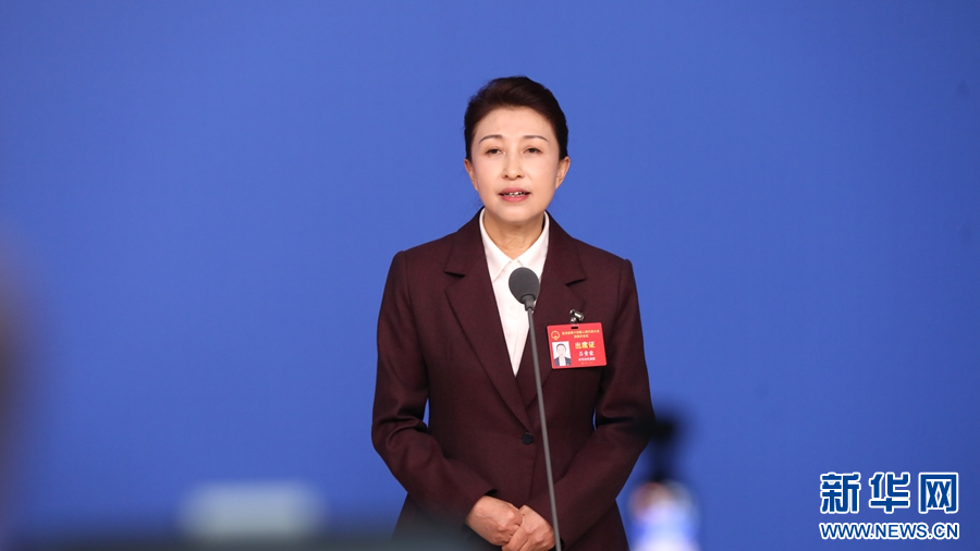 吕贵荣在“代表通道”接受采访。新华网 周远钢 摄