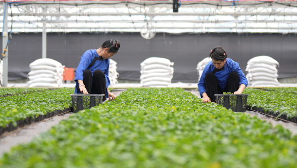 黔东南州榕江县贵州甜甜榕江农业贸易有限公司育苗大棚,工人正在进行迁苗作业。