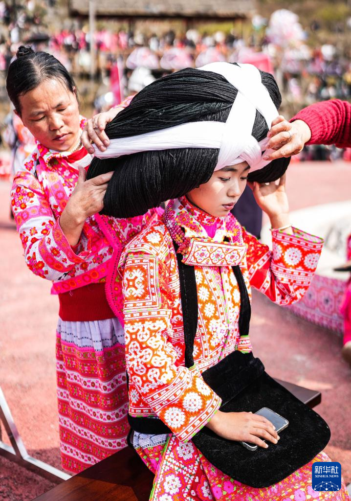 2月26日,在贵州省六盘水市六枝特区梭戛苗族彝族回族乡高兴村跳花场,苗族姑娘在整理头饰。新华社记者 陶亮 摄