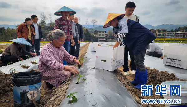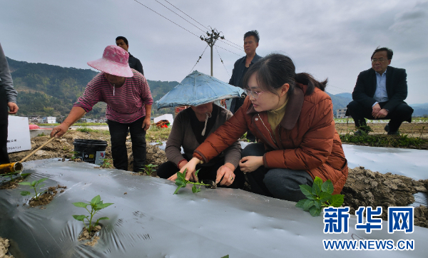 3月6日,贵州大学农学院专家裴芸在田间指导农民移栽辣椒苗。新华网 卢志佳 摄