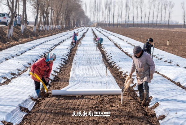 宁夏永宁县李俊镇双晖菜场内,来自贵州的务工人员正在菜地里进行“覆膜”工作。