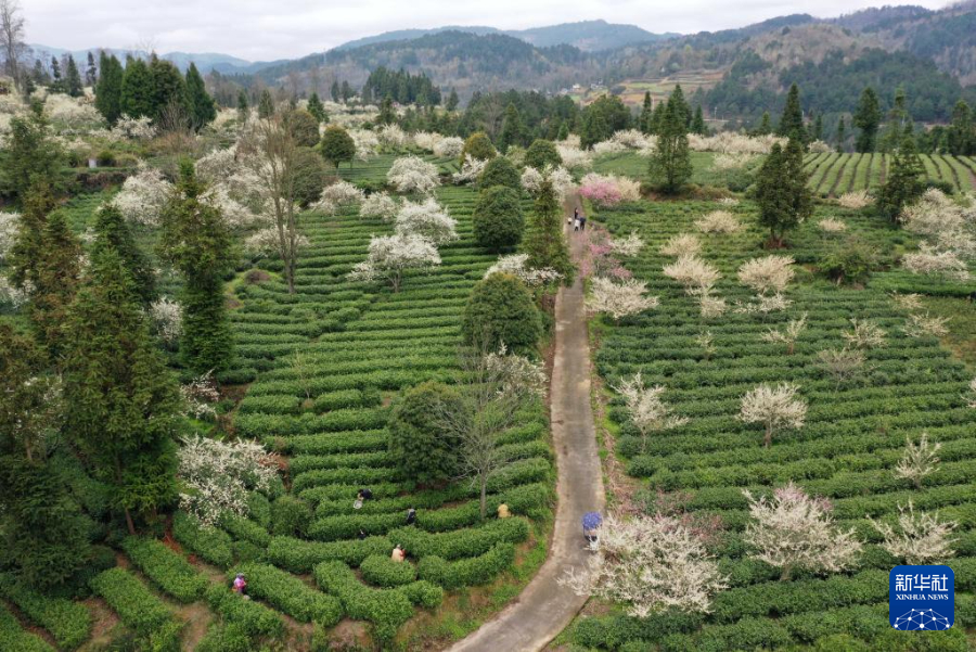 3月21日,村民在贵州省福泉市陆坪镇福兴村茶园采摘春茶(无人机照片)。新华社发(肖伟摄)