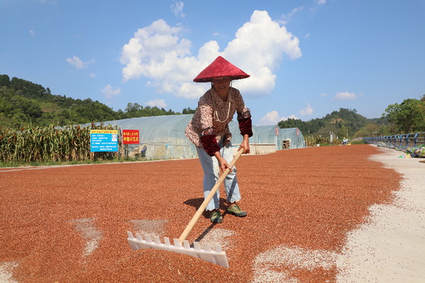 另一边,村民们也在田间地头挥洒汗水忙收割、忙晾晒,有的在地里砍秆、割穗,有的在路边的场坝上脱粒、摊晒,村民们忙碌的背影与火红的高粱地相照应,交织成一幅幅的美丽乡村画卷。