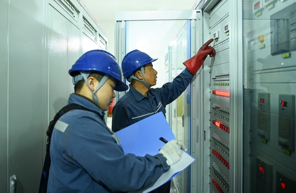 南方电网贵州凯里岑巩供电局工作人员对企业电压柜负荷情况进行核实。(杨启志 摄)