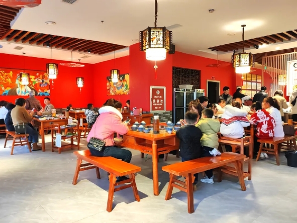 餐馆工作人员也忙碌地为顾客服务,穿梭不绝,堂食的喧闹声衬托了餐厅人气的火爆。