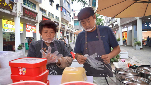 在产品面世的第一天,梁阿姨在摊前忙前忙后,指导着伙计们操作的细节,一时兴起还亲自接待顾客,让大师傅们在旁边“瞧着”。梁阿姨说:“我本来之前就在十字街这边做餐饮生意。听到社区在征集美食,我就想到把自己的秘方分享出来,让更多人尝尝我们地道花溪十字街的好味道,让它们能传承下去。”