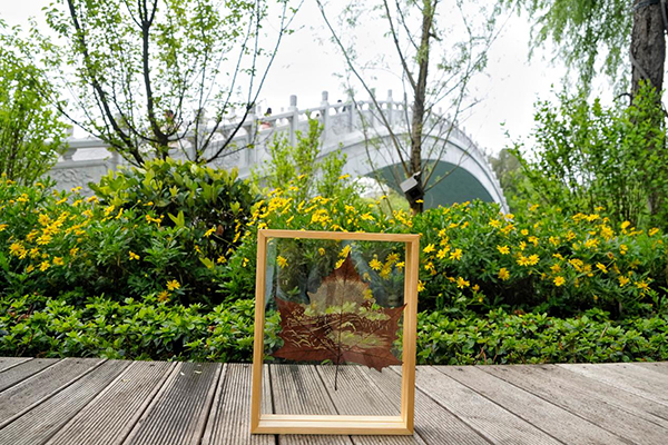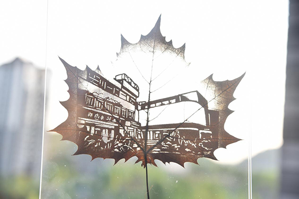 在“十字街非遗文创”的摊位前,游客们最感兴趣的就要数那一幅幅精致的叶雕了。以花溪公园和黄金大道的梧桐树叶为载体,工艺师们用精细的手法和复杂的工序在上面作画。十字街的街景、花溪公园、青岩古镇——让大家一眼就能看出叶雕上这些花溪的“招牌”。