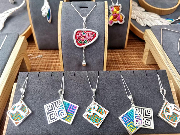 “这个银饰融合了花溪苗绣和苗银的元素,是咱们十字街的LOGO,非常有特色,只有这里才买得到。”十字街社区文创非遗项目推广人刘畅向记者展示手中的工艺品,色彩鲜艳的苗绣和特别打造的银饰相结合,这条可以挂坠活动的项链也是游客们咨询最多的商品。