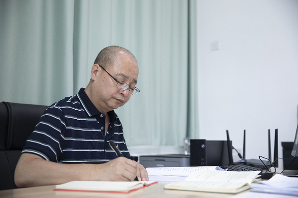 袁荣昌在办公室处理事务。(龙俊宏 摄)