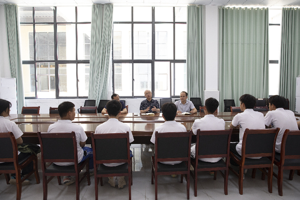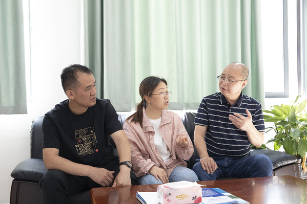 袁荣昌和教师交流教学情况。(龙俊宏 摄)