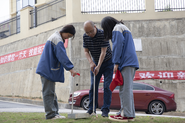 袁荣昌同学生一起打扫校园。(龙俊宏 摄)