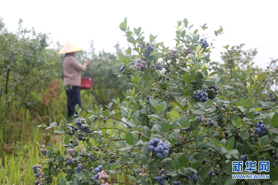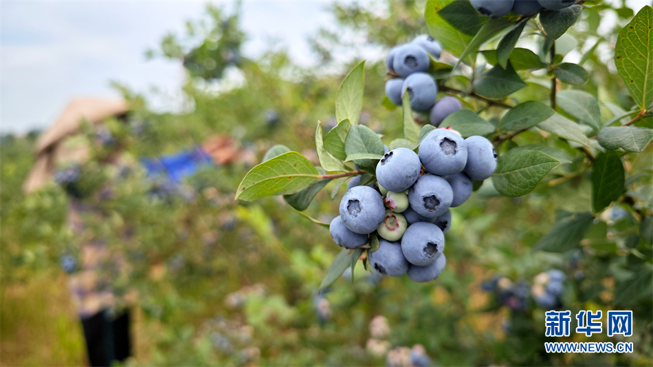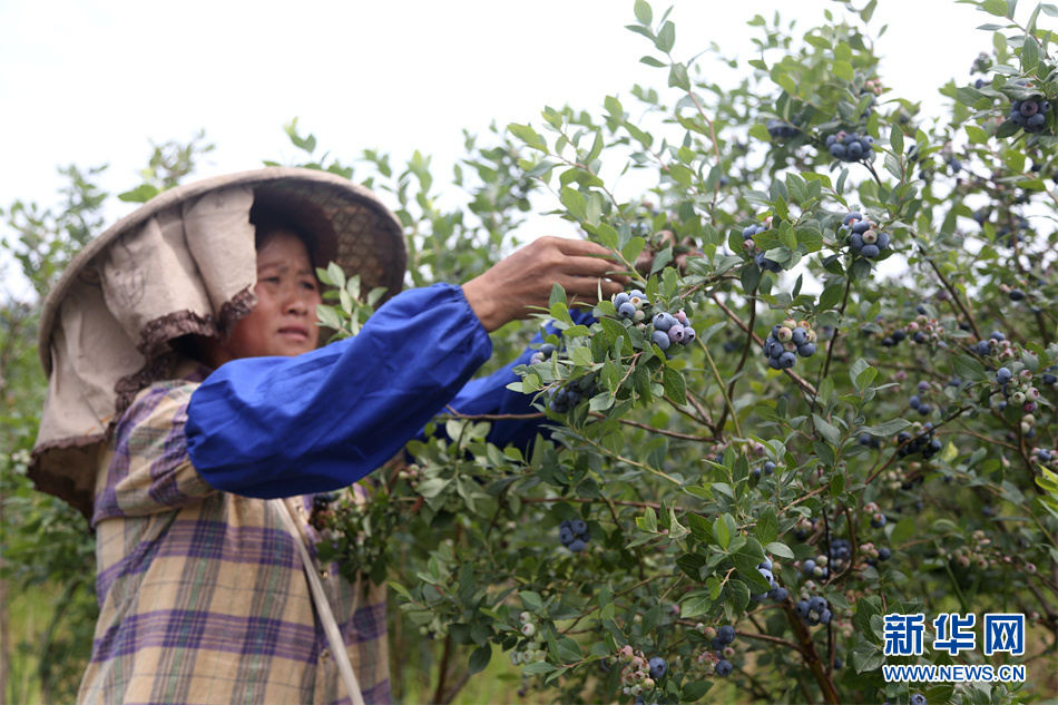 6月9日,村民在蓝梦谷生态蓝莓园采摘蓝莓。新华网 周远钢 摄