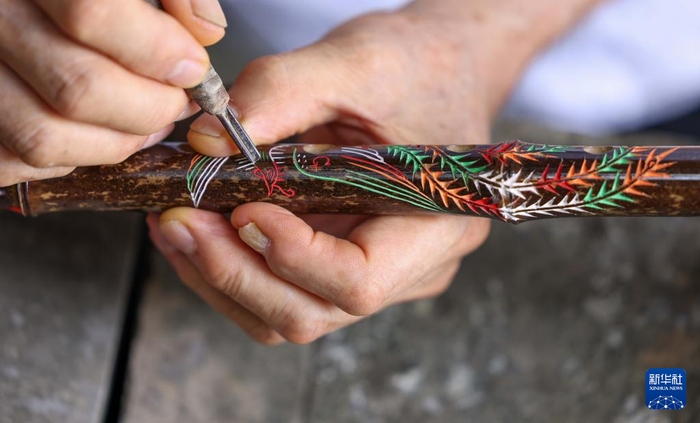 7月2日,在玉屏侗族自治县,国家级非物质文化遗产项目玉屏箫笛制作技艺代表性传承人刘泽松在自己制作的箫笛上雕刻花纹。新华社发(胡攀学 摄)