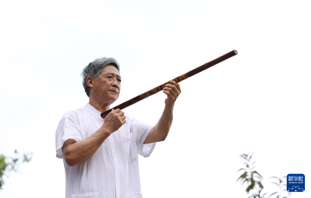 7月2日,在玉屏侗族自治县,国家级非物质文化遗产项目玉屏箫笛制作技艺代表性传承人刘泽松检查自己制作的箫笛。新华社发(胡攀学 摄)