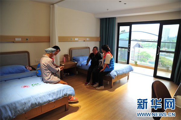 6月21日,关岭县黄果树森林康养基地居住的老人与陪护志愿者聊天。新华网 黄勇摄