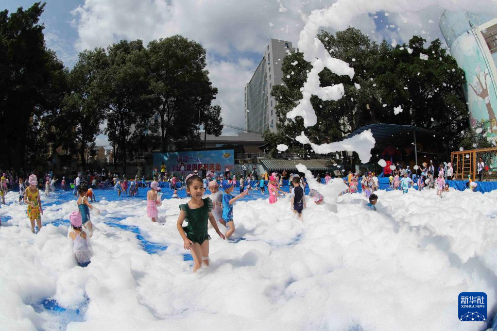 7月6日,贵州省黔东南苗族侗族自治州榕江县古州镇中心幼儿园开展“清凉一夏”主题嬉水活动,小朋友在体验“泡泡浴”。新华社发(李长华 摄)