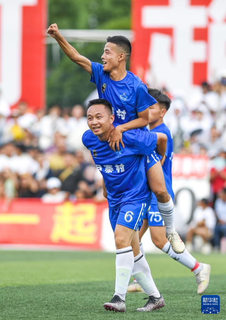 7月15日,月寨村足球队球员李远攀在庆祝进球。新华社记者 杨文斌 摄