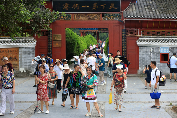 “村超”火,旅游热,7月9日,游客在榕江县三宝侗寨古榕群景区游玩。(杨文舒 摄)